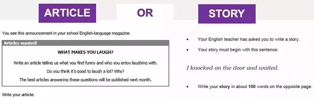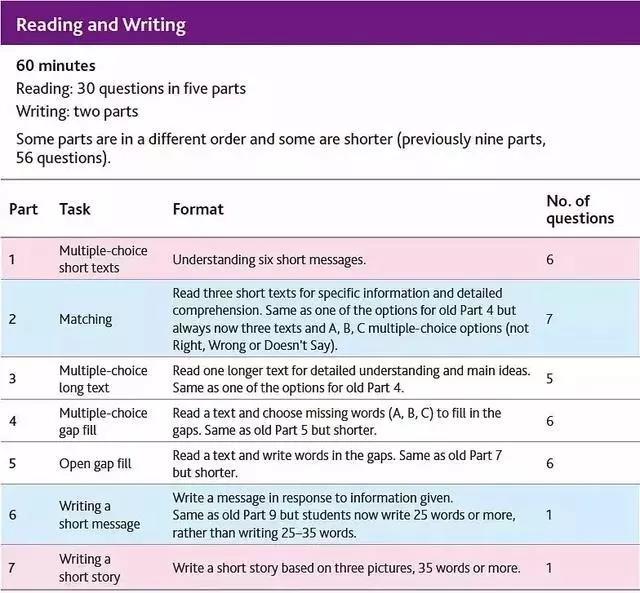 新版KET將舊版考試中該模塊的9部分56道題劍少到7部分32道題,考試時間從70分鐘壓縮到60分鐘;為了全面考察考生在讀寫方面的各項技能與微技能,閱讀材料更加傾向?qū)嵱妙愵}材,內(nèi)容深度有所增加;寫作不僅增加了一篇看圖寫故事,而且兩篇寫作均不再設(shè)字數(shù)上限,為優(yōu)秀的考生提供了更大的發(fā)揮空間。