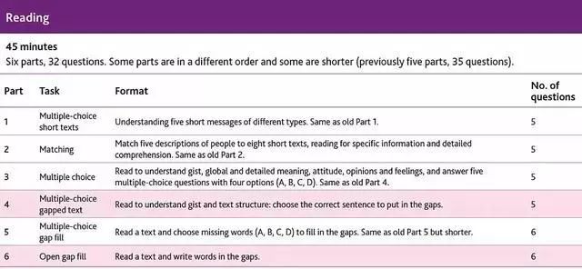 變化最大的是Part 4為新增題型,要求考生理解5段內(nèi)容的主旨思想或觀點態(tài)度,幫助考生開始適應(yīng)PET、FCE的考察方向;此外,Part 3關(guān)于對話信息的考察也從舊版關(guān)注回答轉(zhuǎn)向關(guān)注問答雙方。